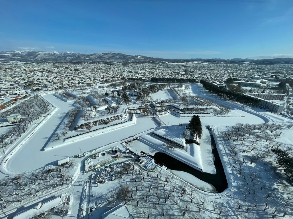 Our first stop is Goryokaku Park. During the day, it’s a historic star-shaped fort. But during the “Hoshi-no-Yume” (Dream of Stars) event, the entire moat is lined with thousands of lights, tracing the star shape in the snow.
