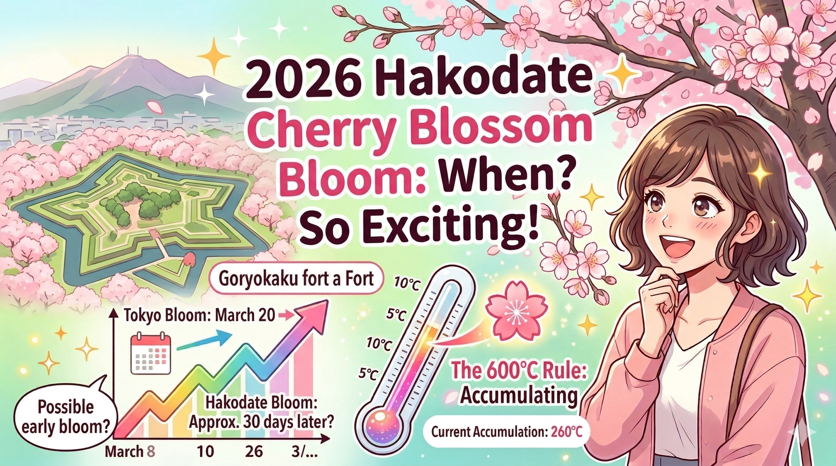On March 20th, the cherry blossoms officially began blooming in Tokyo. For those of us in Hakodate, this news is the ultimate signal to start counting down until Goryokaku Park turns a beautiful shade of pink. Today, I’ll be predicting the 2026 bloom date for Hakodate using two methods: the unique “30-Day Rule” and the … Continue reading [2026 Hakodate Cherry Blossom Forecast] Is the “30-Day Rule” the New Standard? Predicting This Year’s Bloom with Two Key Formulas